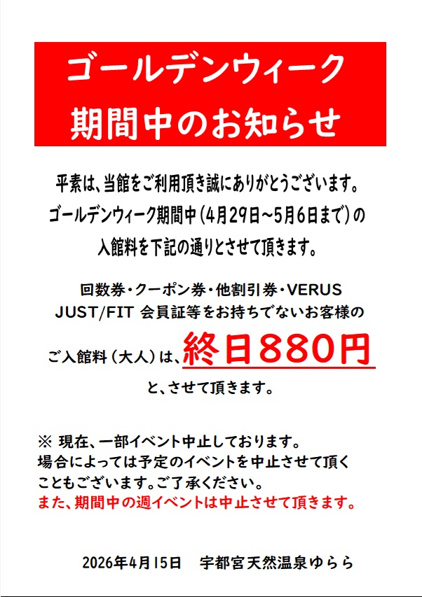 お知らせ | 宇都宮天然温泉ゆらら